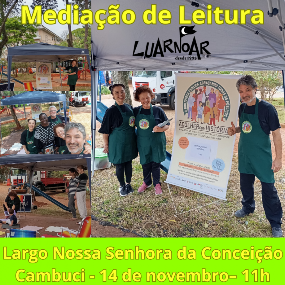 A Mediação de Leituras no Território (14/11, às 09h, no Largo Nossa Senhora da Conceição), conduzida pela Cia Luarnoar e pela mediadora Carla Masumoto, amplia a presença da biblioteca para além de suas paredes. A ação integra o projeto Malas dos Saberes Deslocados, realizado em parceria com o ACNUR (Alto Comissariado das Nações Unidas para Refugiados), e propõe leituras e conversas sobre o refúgio e o respeito às diferenças, envolvendo estudantes e o público espontâneo da região.