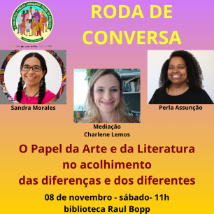 Encerrando a programação, a Roda de Conversa “O papel da arte e da literatura no acolhimento das diferenças e dos diferentes” (08/11, às 11h) reúne Sandra Morales, psicóloga e imigrante peruana com mestrado em Psicologia Social; Perla Assunção, bibliotecária da Fundação Dorina Nowill, referência em acessibilidade cultural; e Charlene Lemos, bibliotecária e coordenadora da Biblioteca Raul Bopp. O encontro propõe uma escuta sensível sobre o poder da arte e das bibliotecas públicas na construção de uma sociedade mais justa e plural.